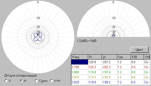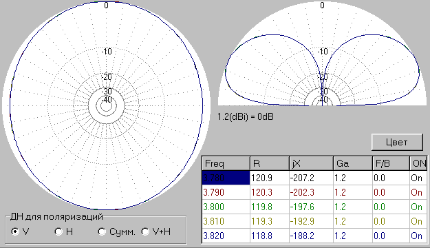 Comments: Antenna radiates radio waves with vertical polarization. A very good pattern with low lobes in the vertical plane. Circular pattern in horizontal plane. It is fine for DX- QSO. Antenna has Z= 119- j197-Ohms at 3800-kHz. Almost any ATU does good matching for such load.