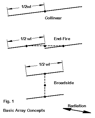 Figure 1 shows three basic arrangements that yield the fundamental categories within which these arrays are specified. Elements are collinear when they are arranged end-to-end so that the main radiation lobes are tangential to the wire. The ends may touch, as in the illustration, or they may be separated by a phasing section, a length of wire or transmission line that alters the current phase and magnitude at the point of junction. Ordinarily, these lines are used to increase the strength of the main radiation lobes.