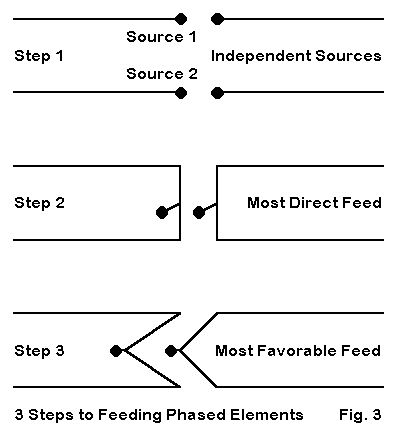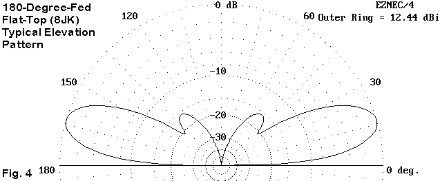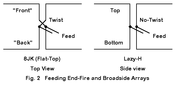 Virtually all flat-top arrays of 2 elements are fed 180-degrees out of phase. The simplest means of achieving this goal is to create two transmission lines of equal length to an added central source wire (junction). One line is reverse connected to its element. Since the current magnitude and phase shift along each line is identical, the reverse connection on one of the lines ensures the out-of-phase condition.