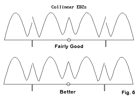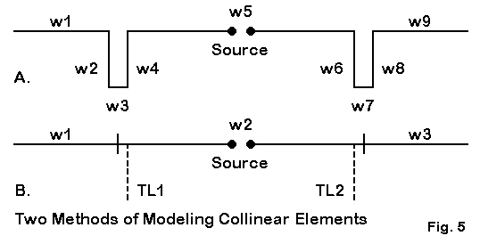 With phasing lines and NEC-2 we always have 2 options, as shown in Figure 5, a representation of collinear EDZ antenna elements. (Of course, only the physical modeling option is open to those who use MININEC. However, it is the initial option of choice for all modeling.)